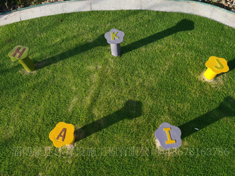 儿童活动区内包括爬网、吊板桥、独木桥、滑梯等,地面为EPDM彩色塑胶面层。
